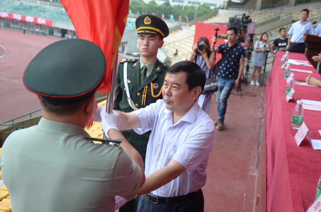 党委书记高文兵为新生军训团授旗