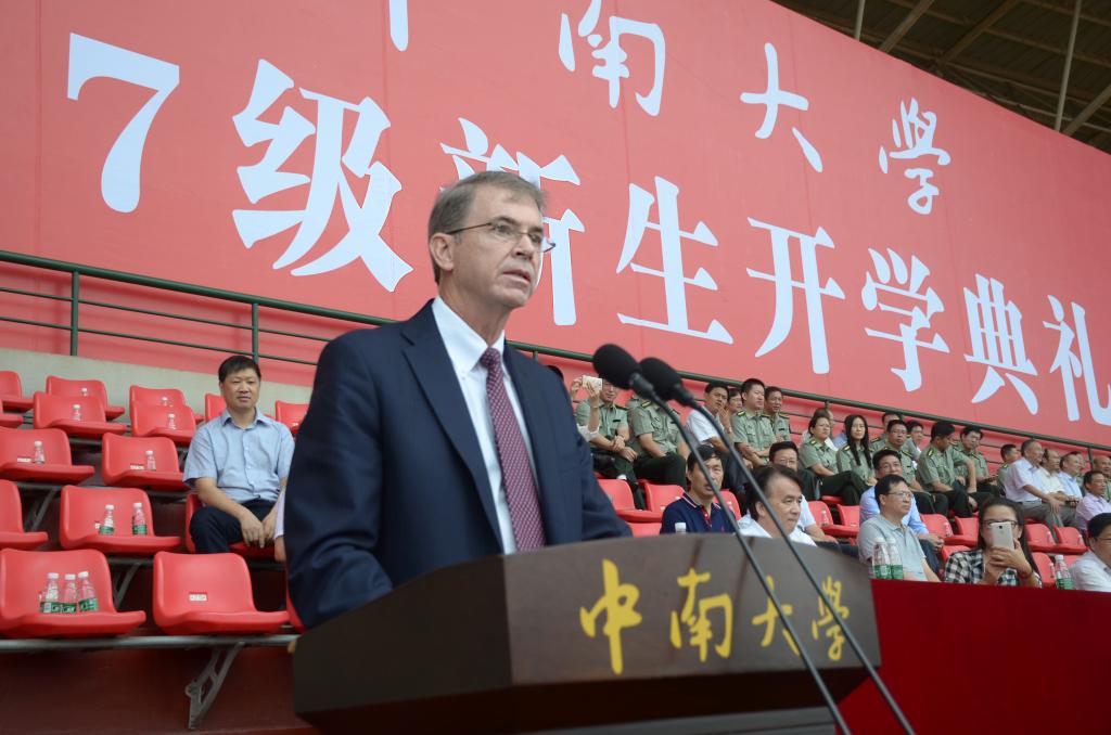 特邀嘉宾提摩西·比利尔先生也表达了自己对新生的欢迎与勉励。他说,中南大学里到处都有值得同学们学习的杰出榜样,希望大家把握时机,尽全力成为自己能够成为的那个人。他还说,“你们是能够让世界变得更加美好的一代。祝愿你们在这场重大的人生转折中,境随心愿,前行路上遇见更美好的自己。”