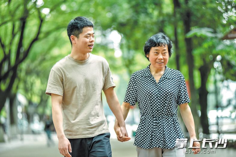 2017年5月,吴步晨牵着妈妈走在铁道校园里。(《长沙晚报》徐飞摄)