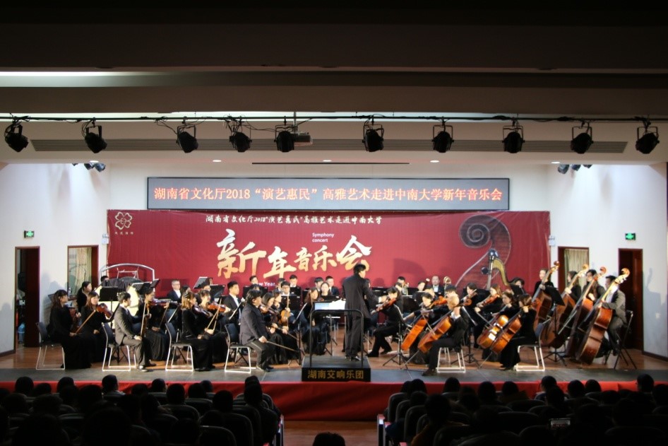 本网讯 1月12日晚,由湖南省文化厅主办,湖南交响乐团、中南大学团委承办,湘雅公共卫生学院团委协办的 “演艺惠民”高雅艺术走进中南大学新年音乐会在湘雅新校区图书馆报告厅奏响。国家一级指挥、中南大学兼职教授肖鸣担任总指挥。校团委胡杨书记,湘雅公共卫生学院杨土保书记,谭红专院长等和湘雅师生300余人聆听了本次音乐会。