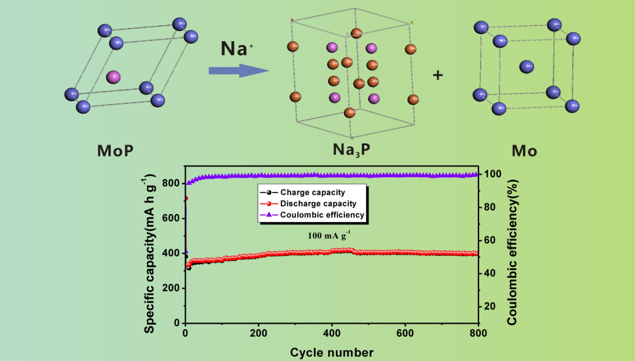 磷化物具有高的理论比容量和良好的导电性,是一种非常有潜力的钠离子负极材料。纪效波教授团队通过改进的高温固相法制备了棒状的磷化钼/碳复合材料,将其首次应用于钠离子电池中,并通过原位XRD技术探究了磷化钼的转化型储钠机制。磷化钼/碳复合材料电极表现出了非常优异的电化学性能,在100 mA g-1的电流密度下循环800圈后仍有400 mAh g-1的比容量,1600 mA g-1的大电流密度下充放电10000次能保持104 mAh g-1的比容量,这是迄今为止报道过的循环稳定性最好的磷化物材料。