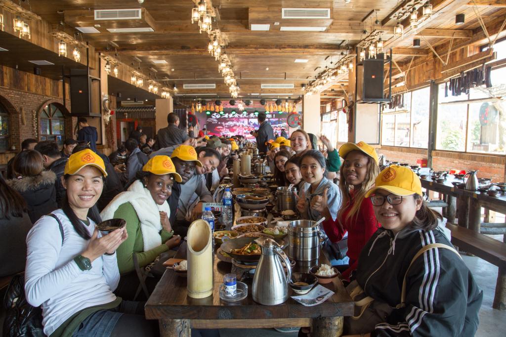 第二天沿着金鞭溪的徒步和民俗文化体验则让他们在闲庭信步间感受张家界的不同魅力。金鞭溪景区有“世界上最美丽的峡谷”之称,植被茂密,是天然氧吧。来自泰国的王林海表示,自己多年前就有了“林海”这个中文名,直到今天才看到了真正的林海。午餐期间,同学们体验了侗族特色民俗——合拢宴。合拢宴是侗族人招待客人的独特宴请方式,海外学子和当地人一起围坐在一条长桌边吃农家菜、喝自酿米酒,倾听被列入世界人类非物质文化遗产代表作名录的侗族大歌,欣赏侗族阿哥阿妹的歌舞表演,气氛十分热烈。来自塔吉克斯坦的沈落更是被邀请到了舞台上,接受了侗族阿妹“高山流水”式的敬酒。作为中文最好的国际学生之一,他不禁感叹到:“阿哥阿妹很热情,米酒很好喝,我太喜欢这里了!”随后,来自俄罗斯、赞比亚等地的国际学生也上台展示了自己的才艺,将气氛推向高潮。来自香港特别行政区的伍字辉也很享受民俗体验活动,“除了看美丽的风景,我们还有机会参与到少数民族的民俗中来,这让我们更加了解了祖国的少数民族,感受到了祖国多元文化的魅力。”