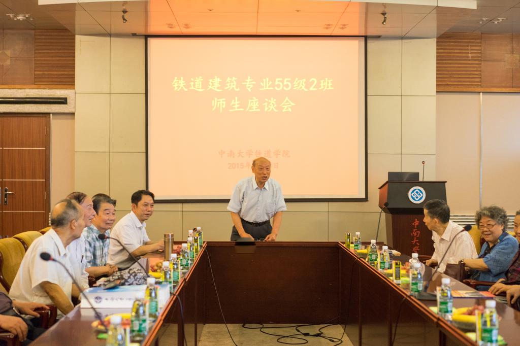 本网讯:5月18日上午,我校铁道建筑专业55级2班校友聚会暨师生座谈会在铁道校区世纪楼14楼会议室举行。原长沙铁道学院副院长段承慈,中南大学副校长陈春阳,中南大学党委副书记、纪委书记李亮出席座谈会,远在北京的田红旗副校长发来祝贺信息。土木工程学院党政班子、部分相关教师代表、在校学生代表与返校校友欢聚一堂,重叙师生谊,畅谈母校情。