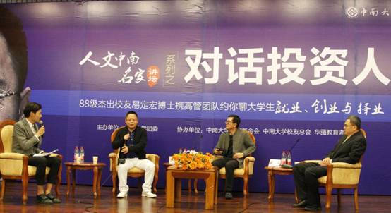 本网讯:3月28日下午,由共青团中南大学委员会、中南大学大学生文化素质教育中心联合主办,中南大学教育基金会、校友总会、华图教育湖南分校协办的“人文中南·名家讲坛”系列之对话投资人第一期活动在校本部科教楼报告厅举行。我校88级杰出校友、华图教育集团董事长易定宏博士,华图教育联合创始人于洪泽博士,副董事长褚峰老师,校团委胡杨书记,校教育基金会、校友总会张忠生秘书长,部分88级校友以及湖南省各高校学生近400人出席了本次活动。