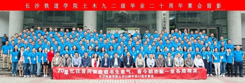 为庆祝毕业20周年,原长沙铁道学院1992级土木系180名校友在铁道校区齐聚,校友们重返校园,一路参观了铁路园、爱国广场、运动场以及当年的教学楼和宿舍区,共同回忆自己当年学习和生活的每一个情节,并与当年的任课老师在世纪楼前合影留念,一起叙谈当年的师生情谊。