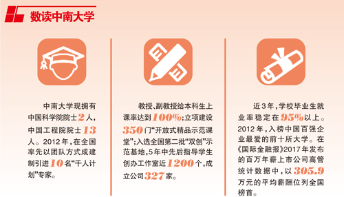 积极参与实施卓越工程师、卓越医生、卓越律师教育培养计划,针对不同类型学生因材施教;加强临床医学专业学生的技能培养,鼓励学生参加全国医学生临床技能大赛等专业赛事;入选首批全国高校实践育人创新创业基地,成为中国百强企业最受欢迎的10所大学之一……这几年来,中南大学推出的一系列改革措施正稳步推进,改变着整个校园的面貌。正如中南大学“知行合一,经世致用”的校训一样,创新的基因植入每一个中南人的血脉中。