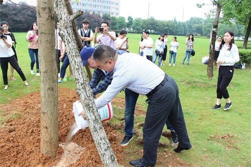 蒋建湘与同学们一起培土、浇水,共同种植了一颗毕业纪念树。毕业纪念树承载着少数民族同学对学校深厚的感情,寓意中南大学如树木一样郁郁葱葱,枝繁叶茂。同学们纷纷在树前拍照留念。