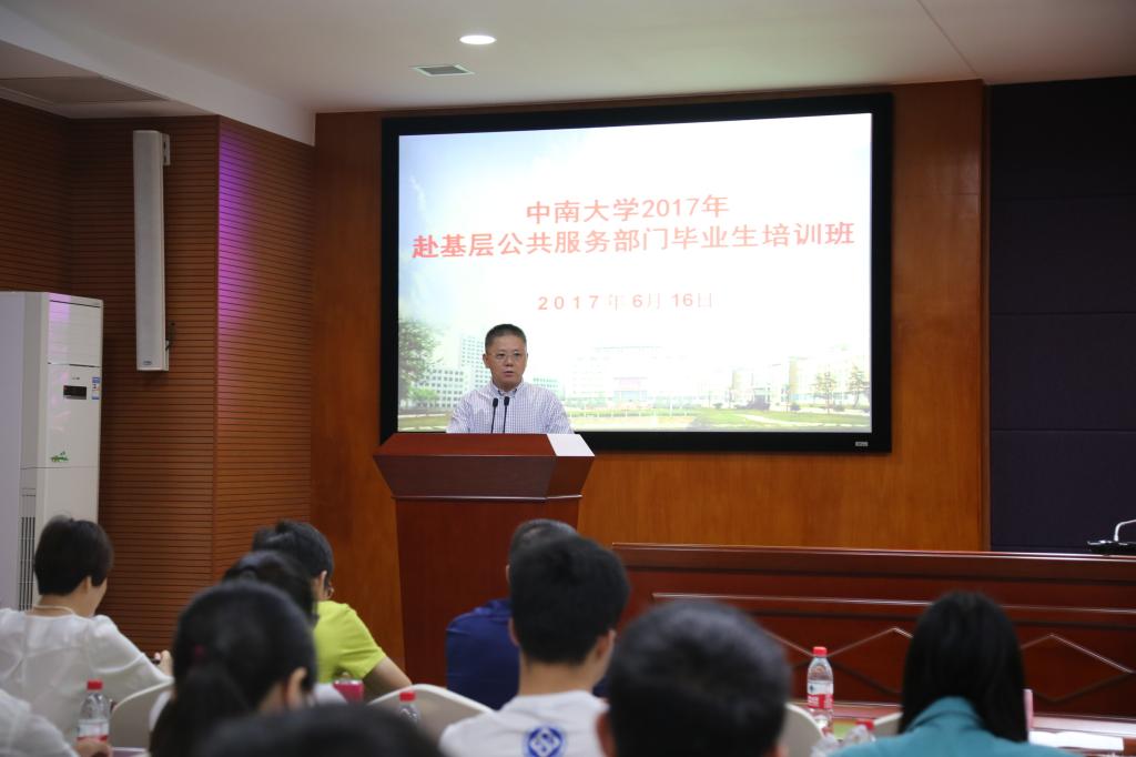 本网讯 6月16日,中南大学2017年赴基层公共服务部门毕业生培训会在校本部科教楼四会议室召开。校党委蒋建湘副书记在开班仪式上讲话,学生工作部余文武部长、毕业生就业指导服务中心蒋直平主任、组织部邹庆林副部长参加开班仪式。培训由党校常务副校长赵永正主持,2017届考取各省(市、区)选调生的160余名毕业生及西藏籍的20余名毕业生参加了本次培训。