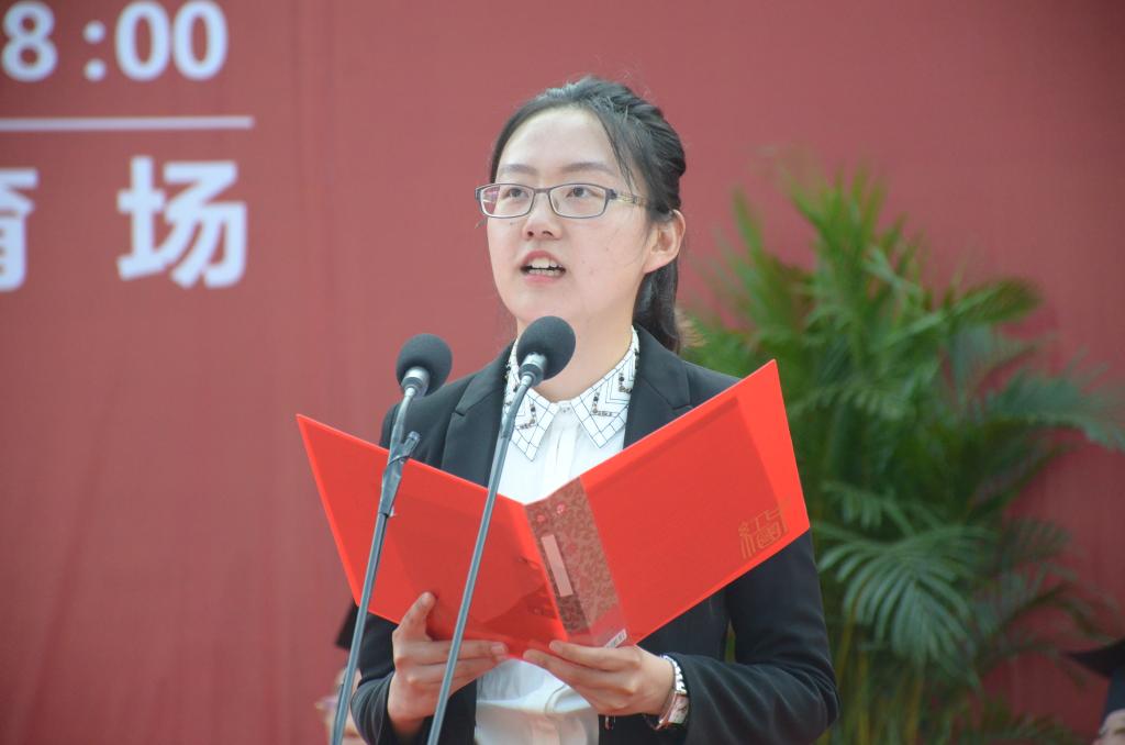 研究生代表洪惠卿向陪伴了自己七年的母校大声表白,她喜欢这里的一砖一瓦,本部的香樟路、新校的操场,铁道的梧桐路、湘雅的校园,最爱的还是这片土地上可亲可敬的老师和同学们。在分别的时刻,她呼吁同学们:带着爱、忠诚、坚持,怀揣梦想的初心,带着中南给予的知识和力量高飞,让中南的旗帜高高飘扬!