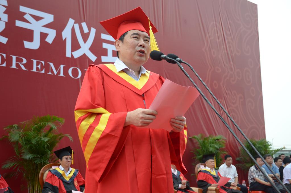 常务副校长胡岳华宣读中南大学学位委员会决议:7829名本科生获学士学位,5139名研究生获硕士学位,722名博士生获博士学位。院士和校领导们为获得学位的毕业生代表颁发学位证书、挑苏留影。